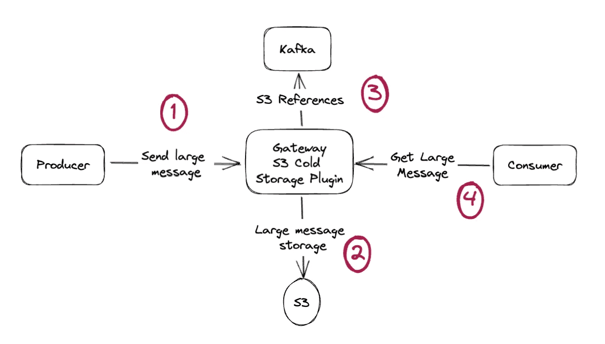 Our S3 Cold Storage plugin implements the claim check pattern transparently. Applications change nothing. They send large messages normally. Magic happens.