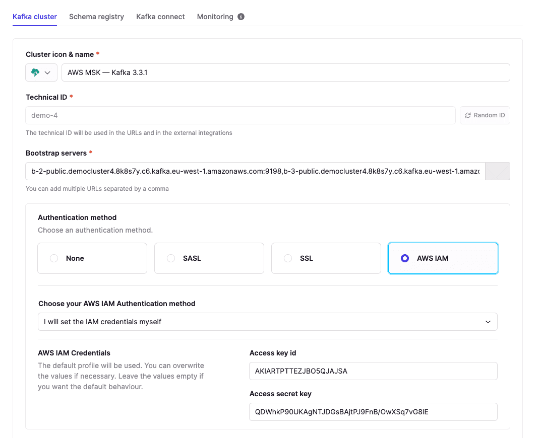 Using dedicated AWS access keys: In your Conduktor cluster configuration, select "I will set the IAM credentials myself."
