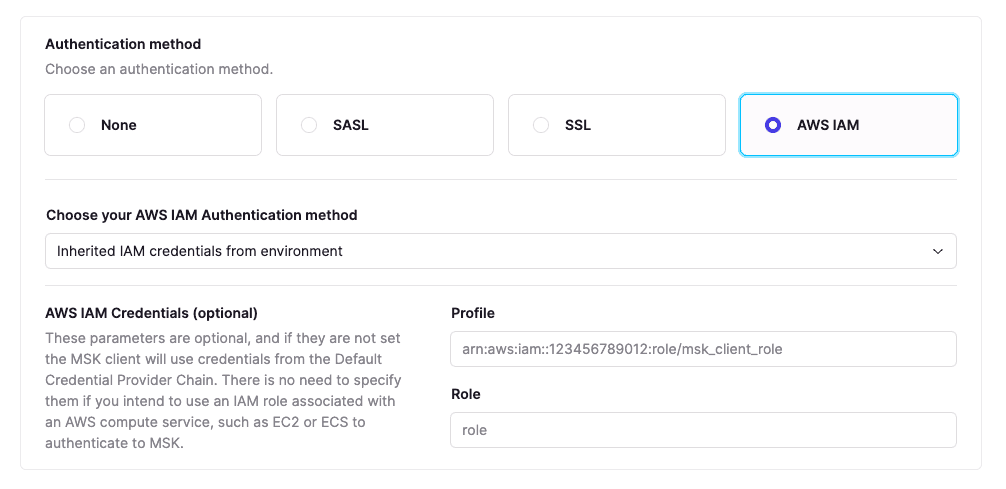 Using IAM roles: Select "Inherited IAM credentials from the environment." Conduktor uses the standard AWS Default Credentials Provider Chain to find the right IAM role.