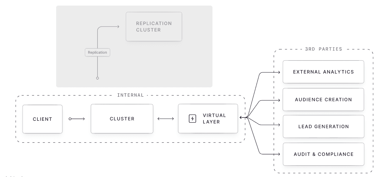 This vendor-agnostic layer increases utilization per cluster. It also enables data isolation (multi-tenancy with tenant-specific rules) and virtual topics via SQL statements for data projections, without deploying additional infrastructure.