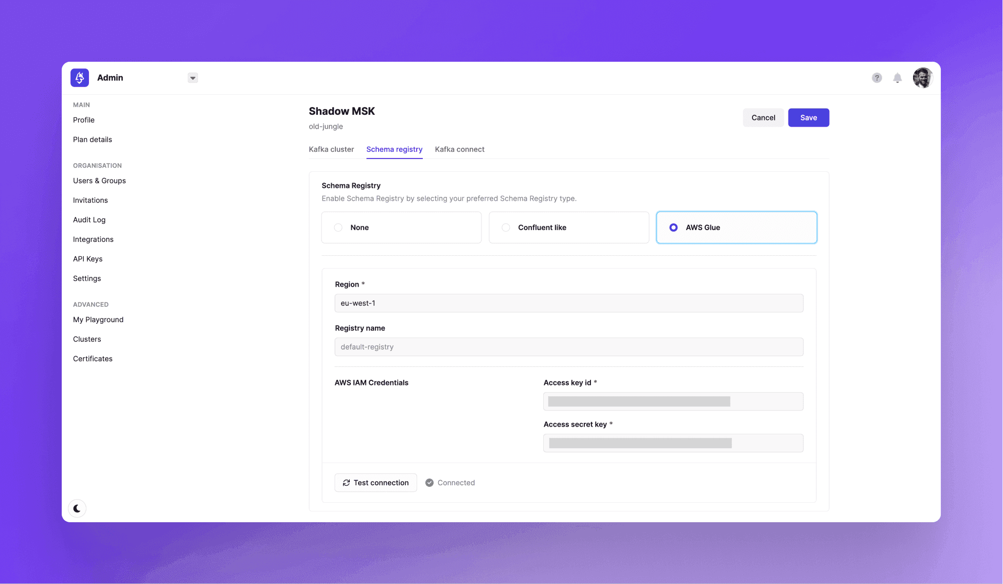 - Connect to MSK using IAM credentials from the deployment environment or custom Access Key and Secret