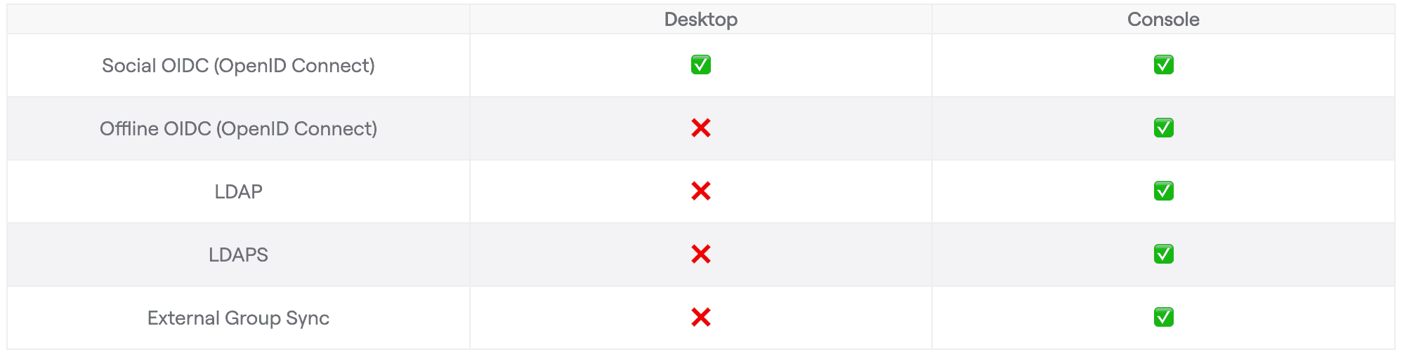 Both Desktop and Console support Single Sign-On. The difference is in protocol support.