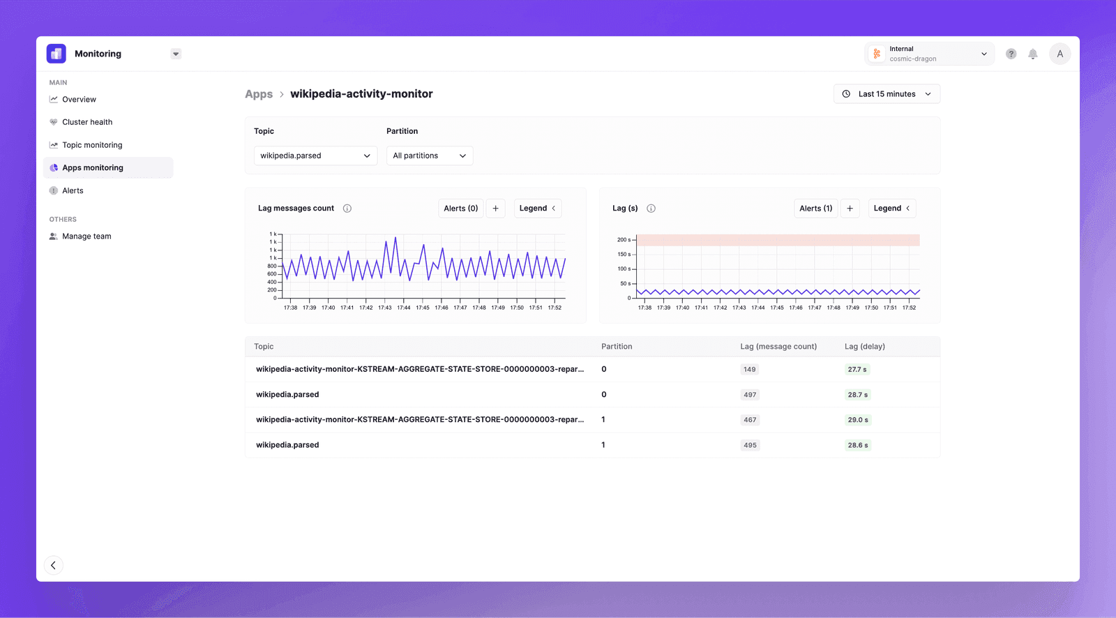 Console sends real-time notifications: lagging consumer groups hitting thresholds, under-replicated partitions.