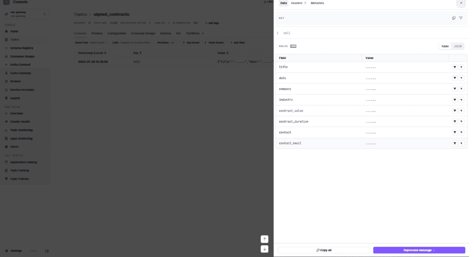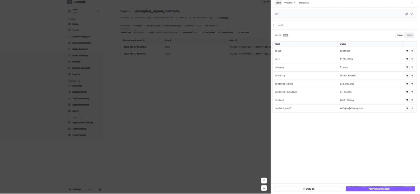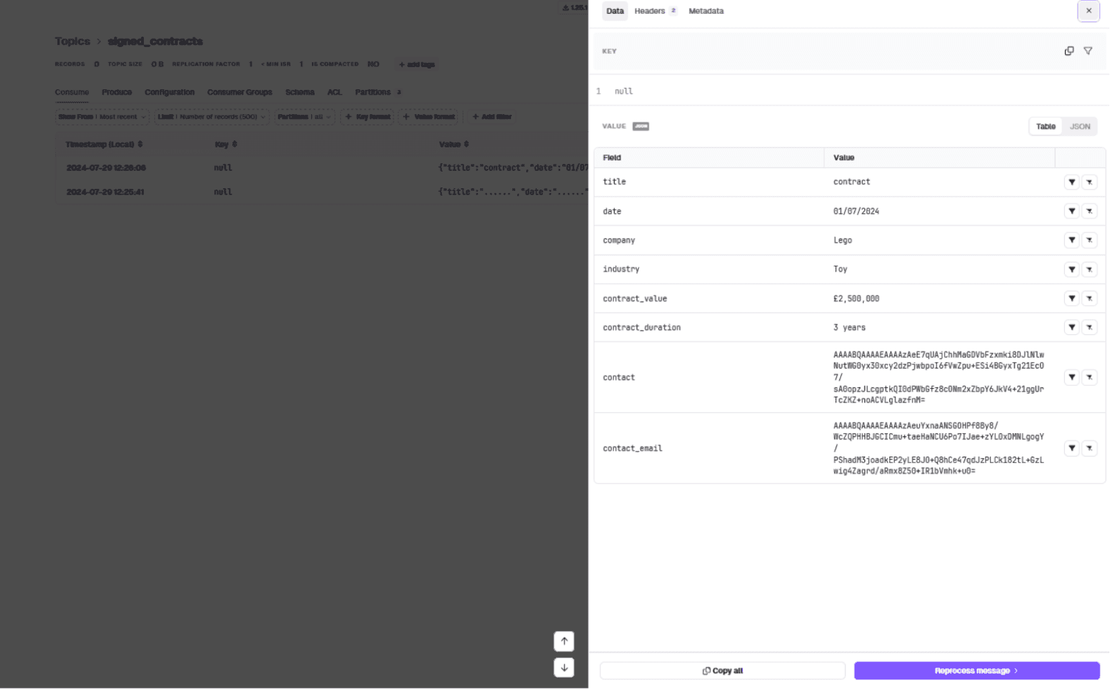 All contracts entering the pipeline now have personal details encrypted at rest. The interceptor sits on Gateway's Kafka proxy and acts on each message produced to the signed_contracts topic.