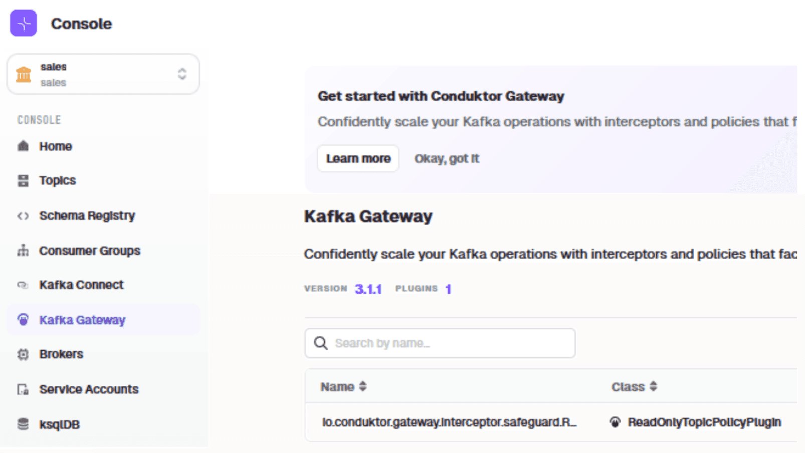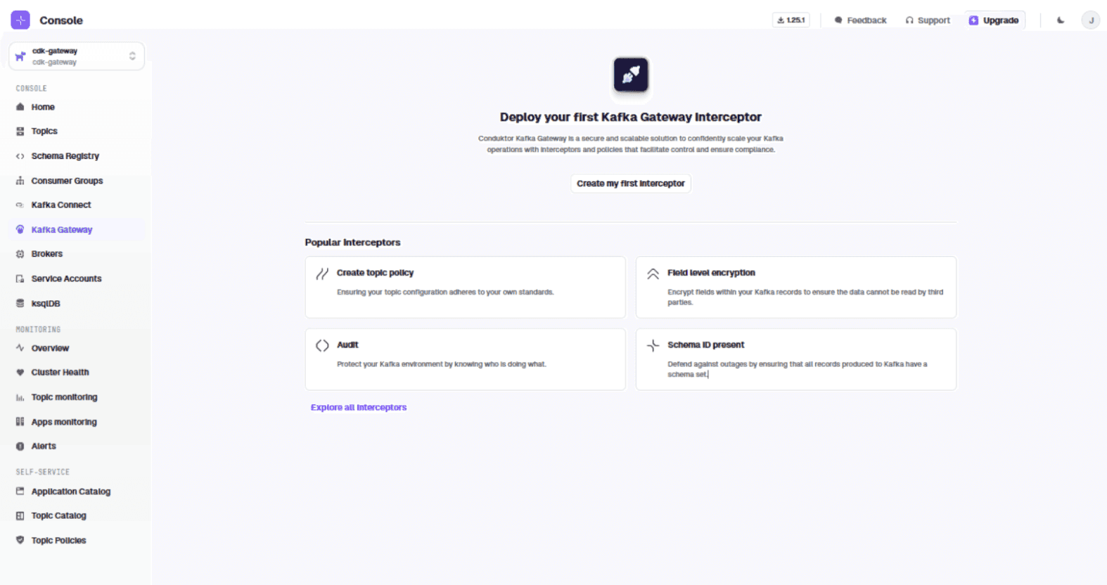 In the UI, go to Kafka Gateway and click 'Create my first interceptor'.