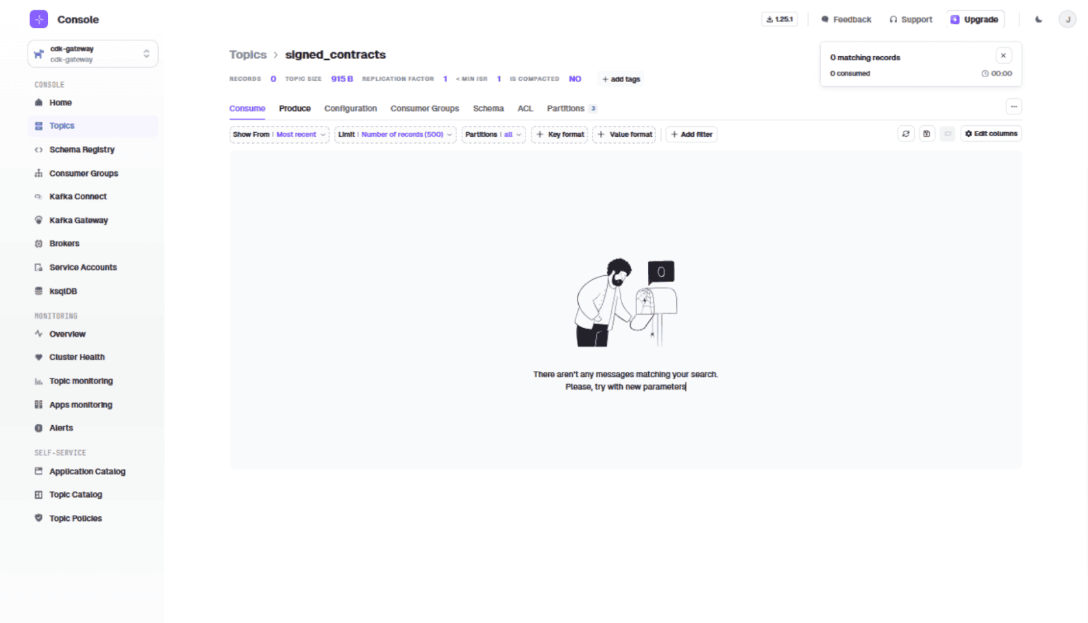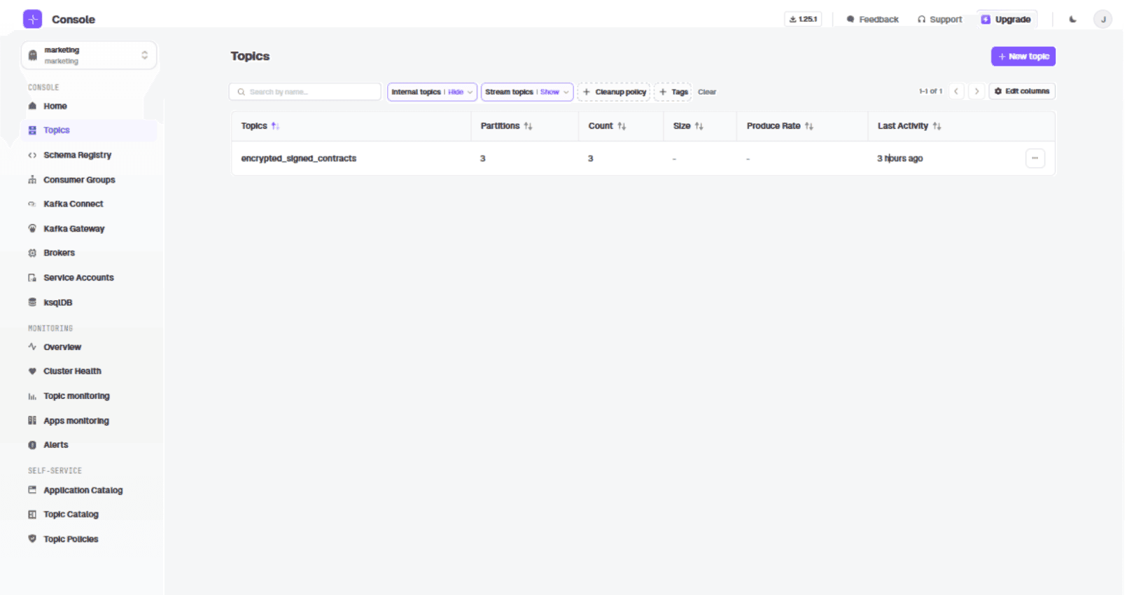 --data-raw '{ "physicalTopicName": "signed_contracts", "readOnly": true, "type": "alias" }' | jq The alias encrypted_signed_contracts hides the physical topic name from marketing. Reopen the topics tab when switching between clusters.