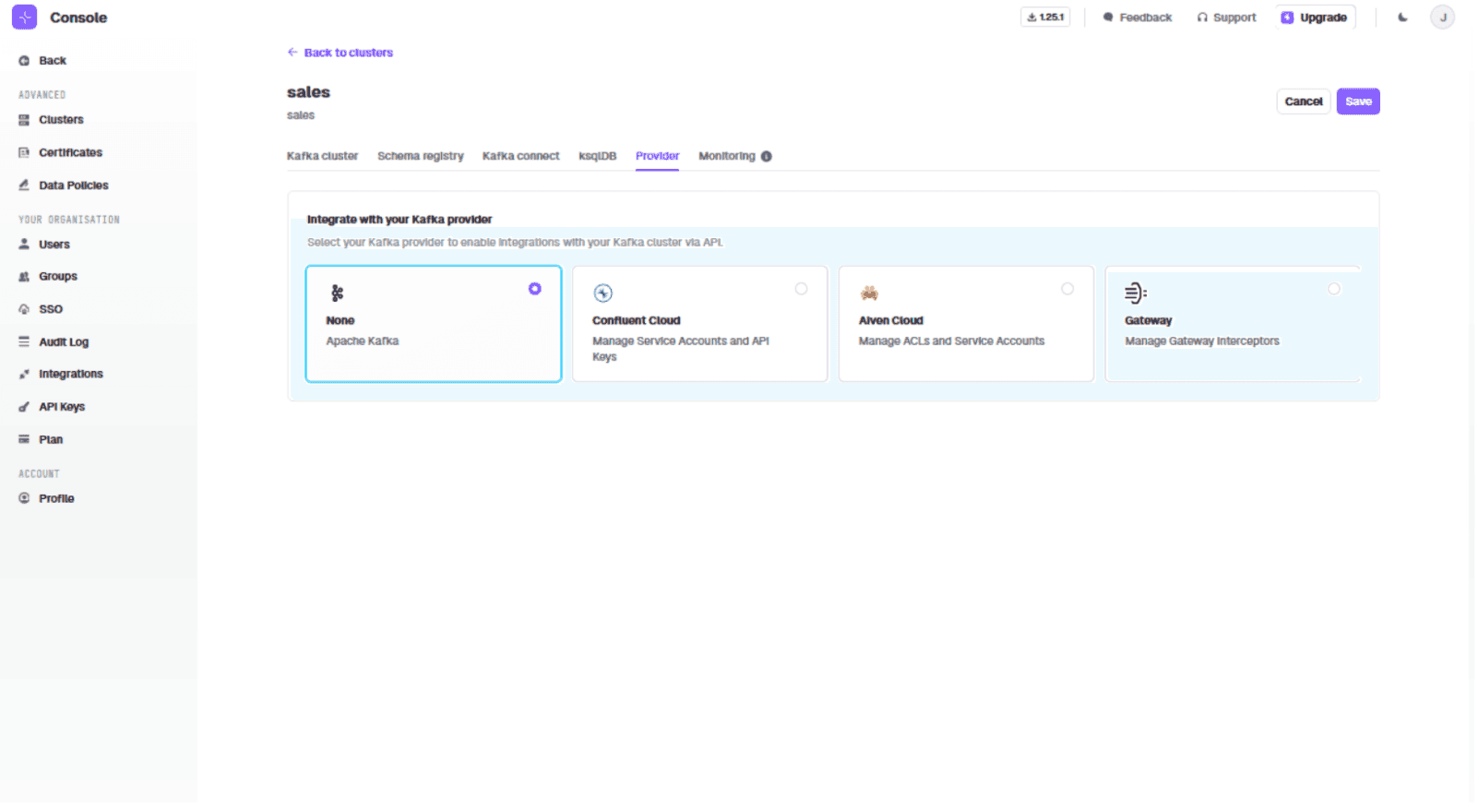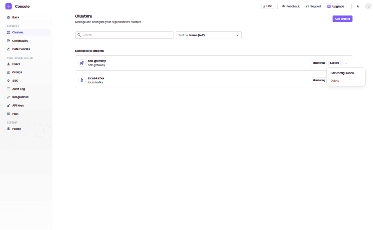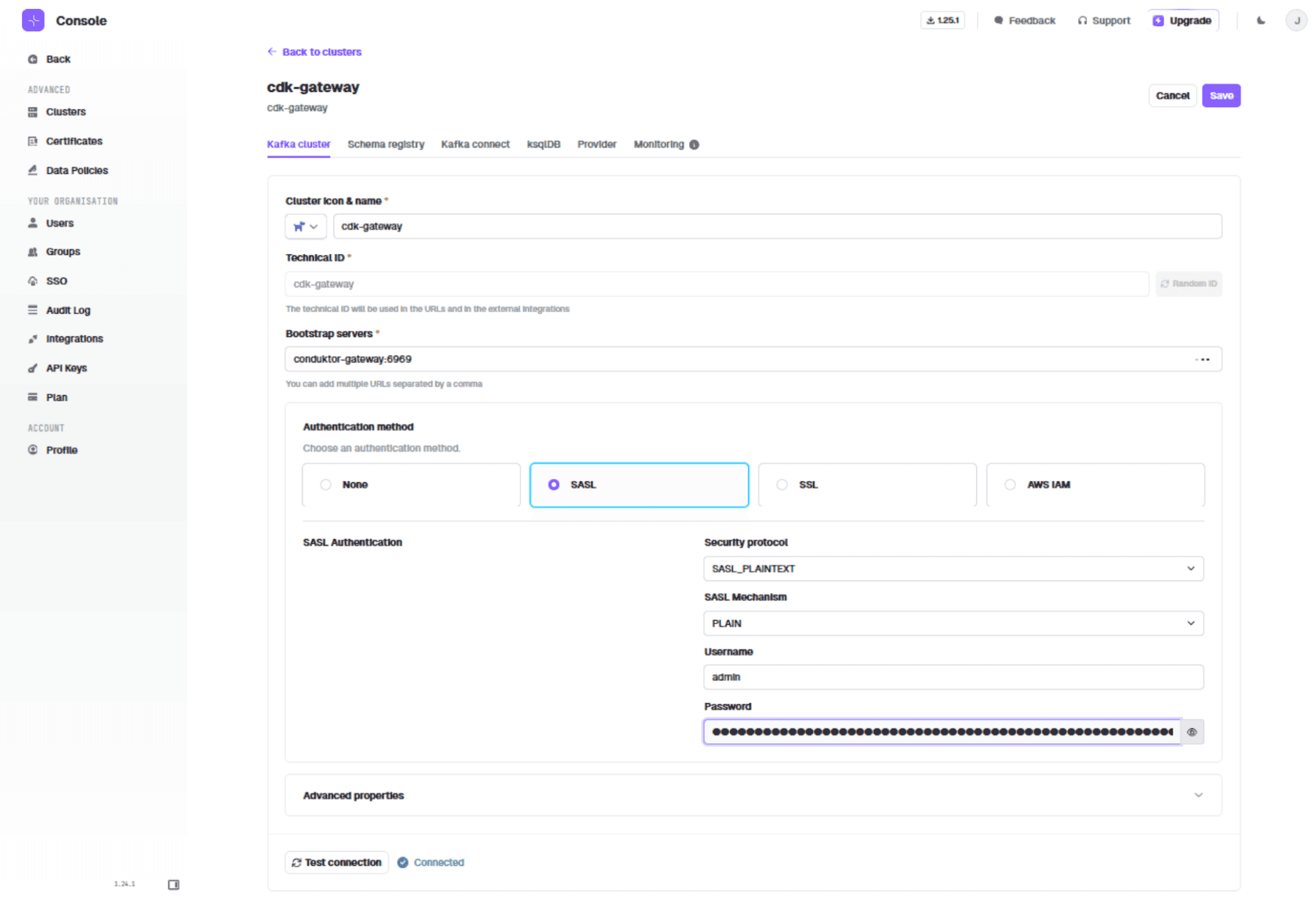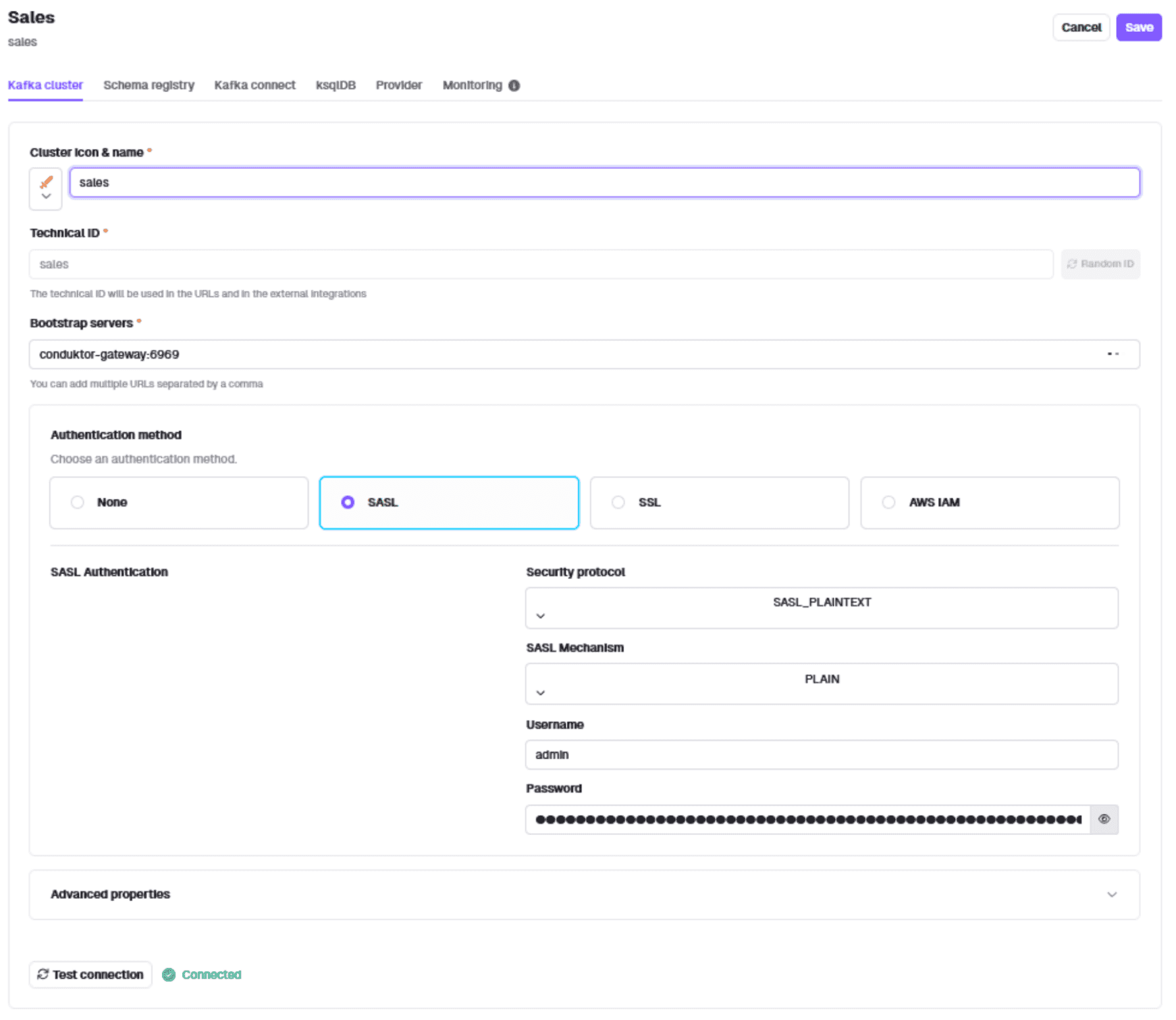 curl --request POST 'http://localhost:8888/admin/vclusters/v1/vcluster/sales/username/admin' \--user 'admin:conduktor' \--header 'Content-Type: application/json' \--silent \--data-raw '{"lifeTimeSeconds": 7776000}' | jq -r '.token' | tee sales-admin.properties Add the sales cluster in Conduktor Console using 'Manage Clusters'. Use SASL_PLAINTEXT, PLAIN, the Gateway bootstrap server, and the sales vCluster token as password.