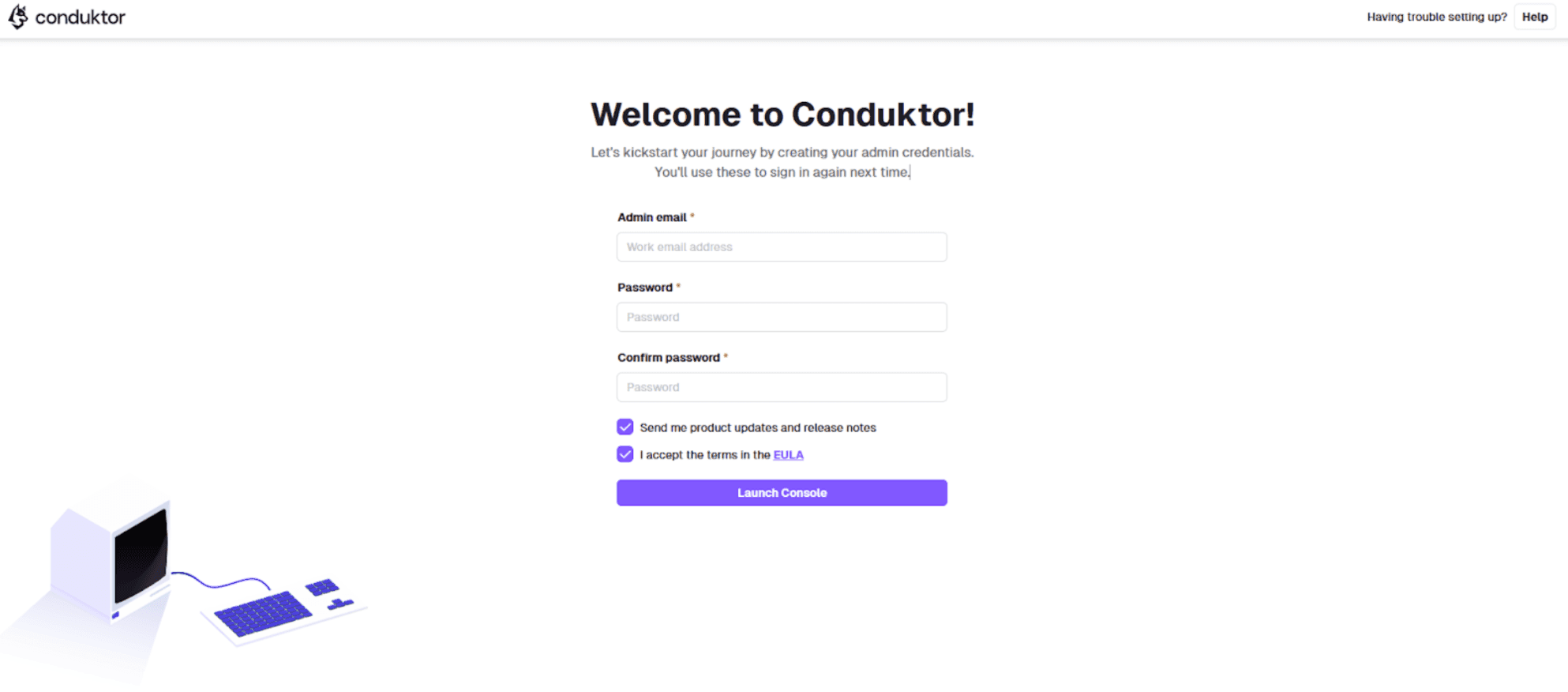 Once ready, open Conduktor Console at http://localhost:8080 and enter your details.