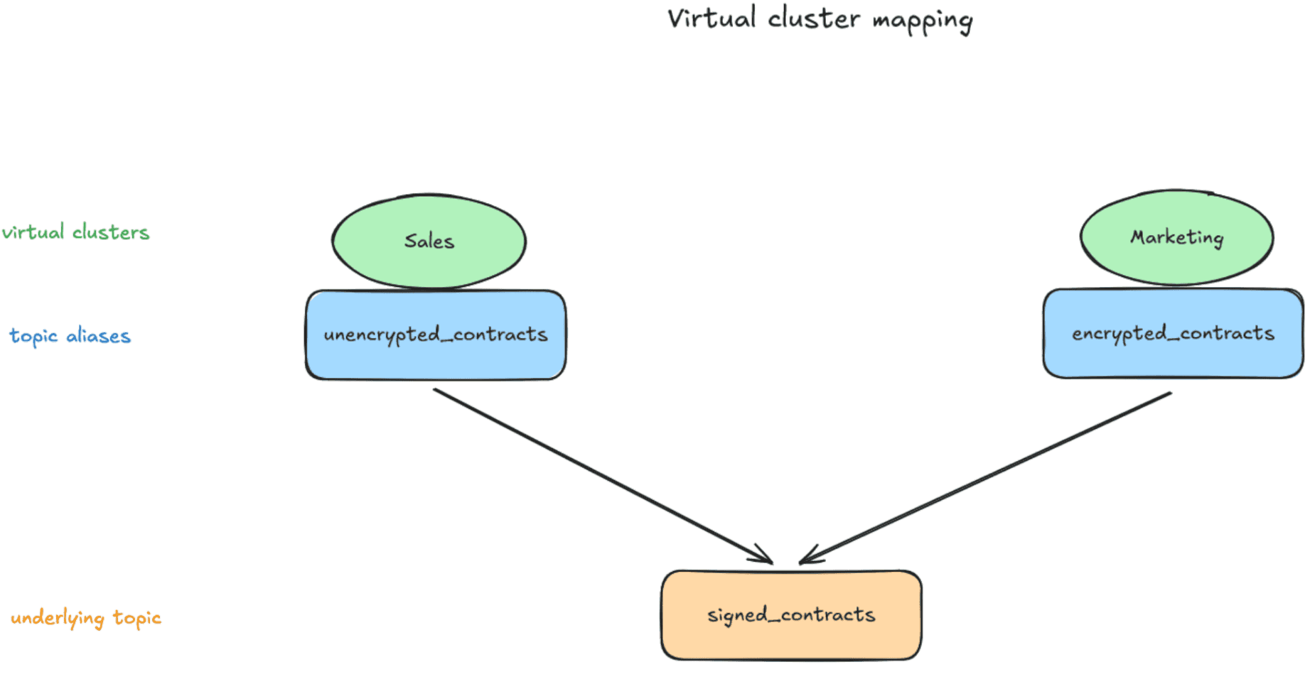 This diagram shows the vClusters we will create, their topics, and the physical cluster topic they map to: