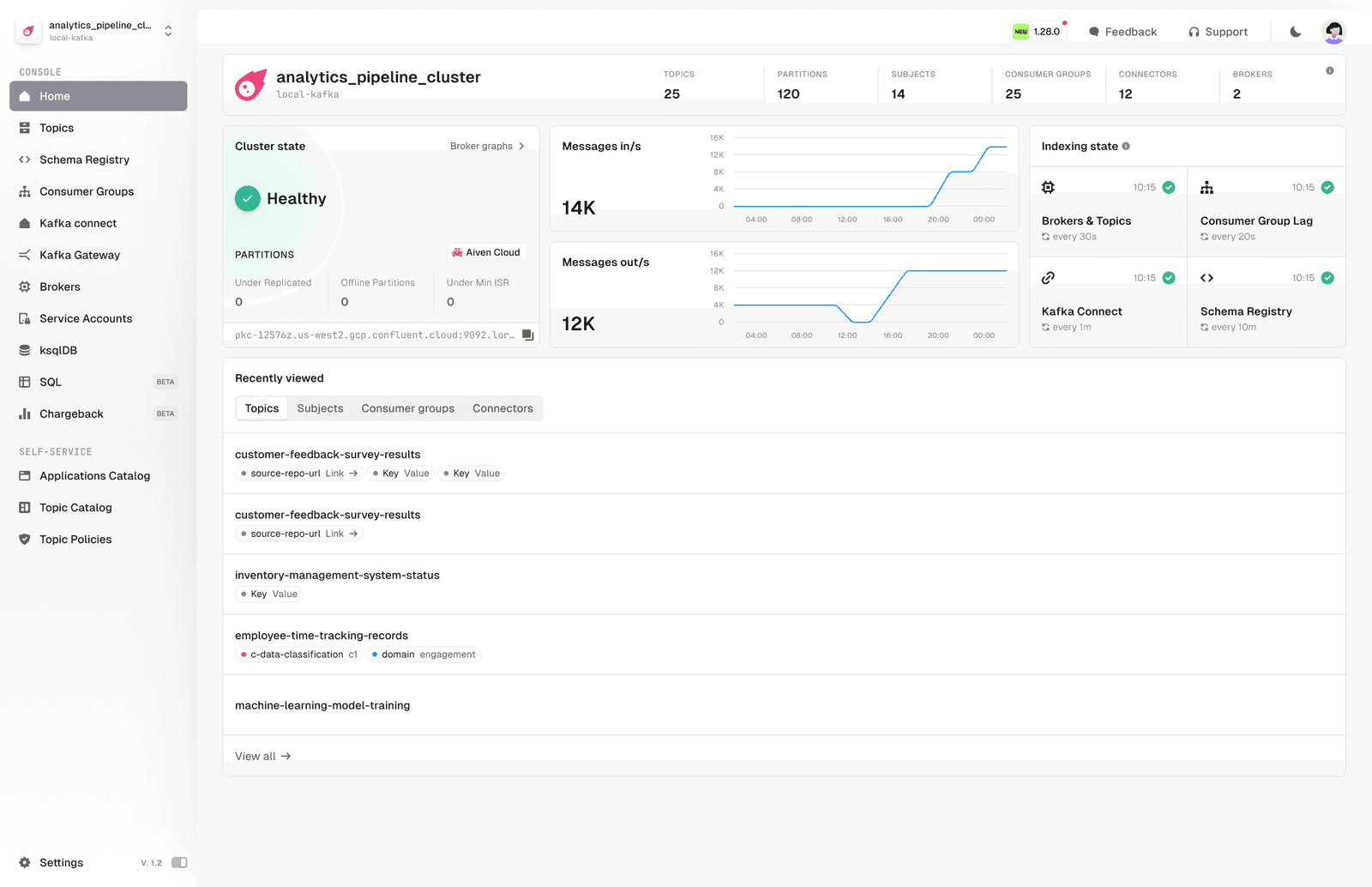 The redesigned homepage shows Kafka cluster health, indexing module status, and recently viewed resources.