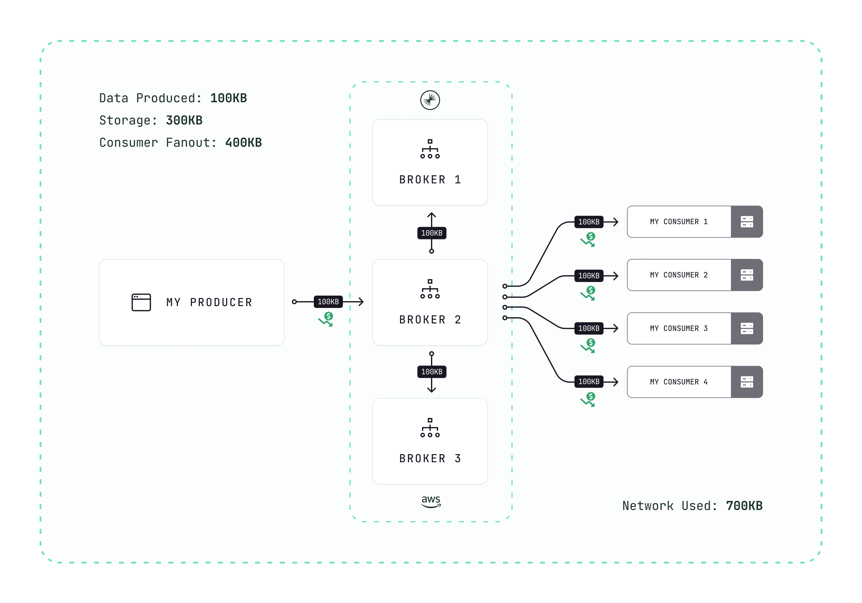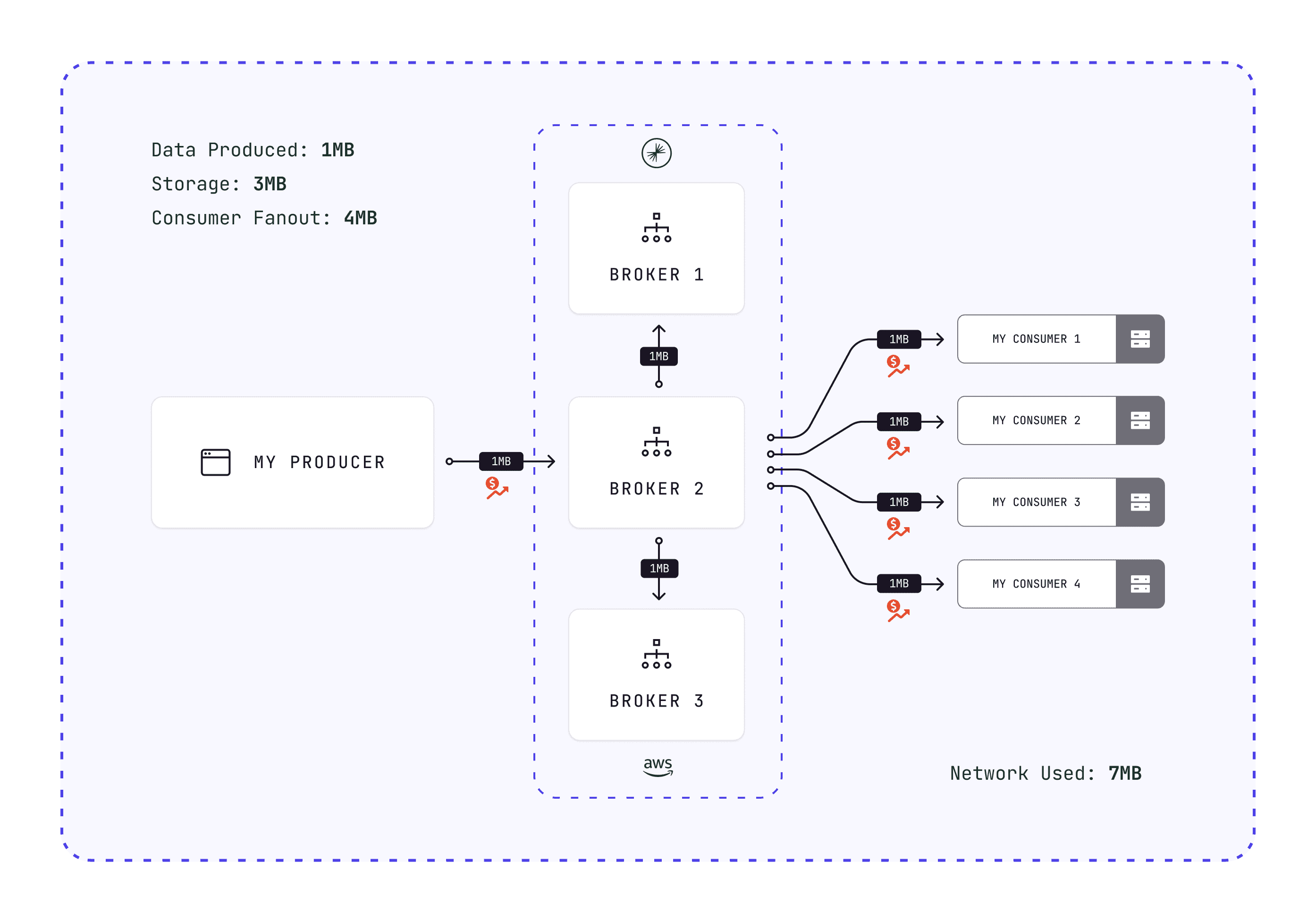 1 MB produced = 3 MB storage + 3 MB networking. Four consumers add 4 MB more.