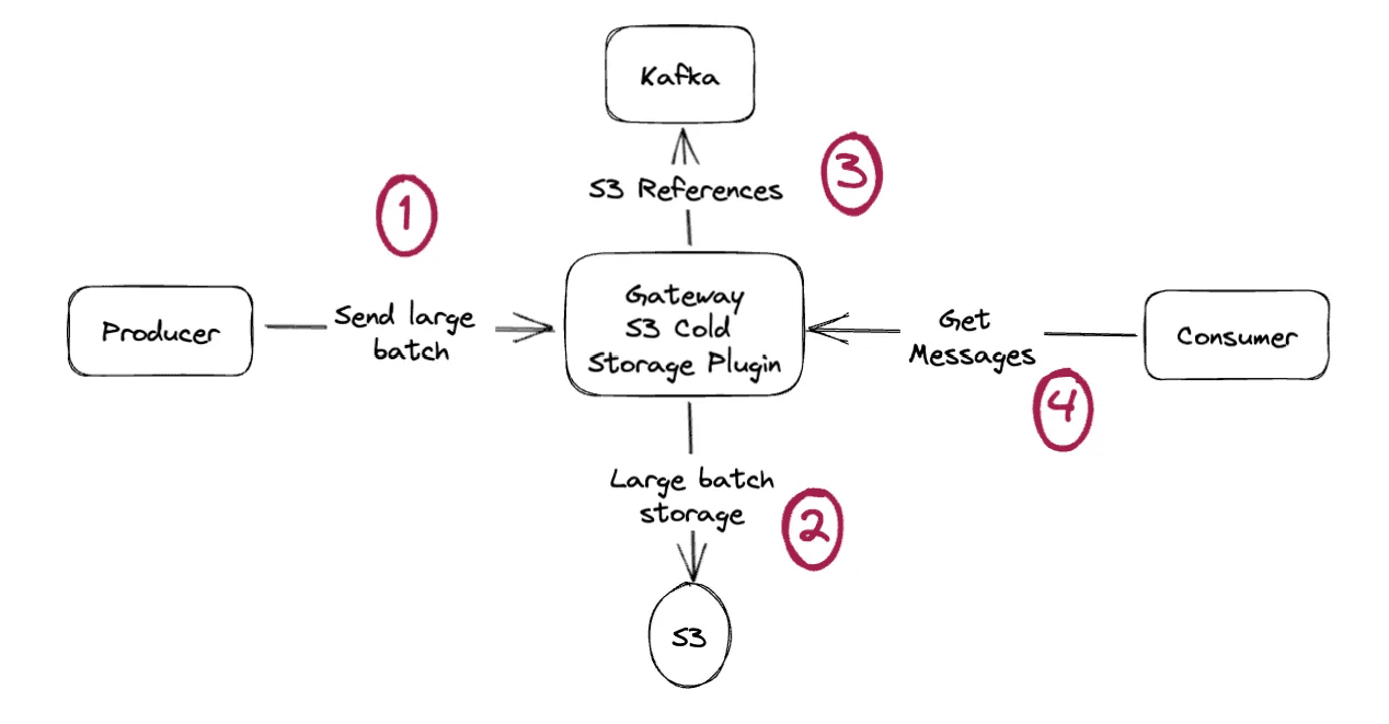 Our S3 Cold Storage plugin implements the claim check pattern transparently. Applications change nothing. They send large messages normally. Magic happens.