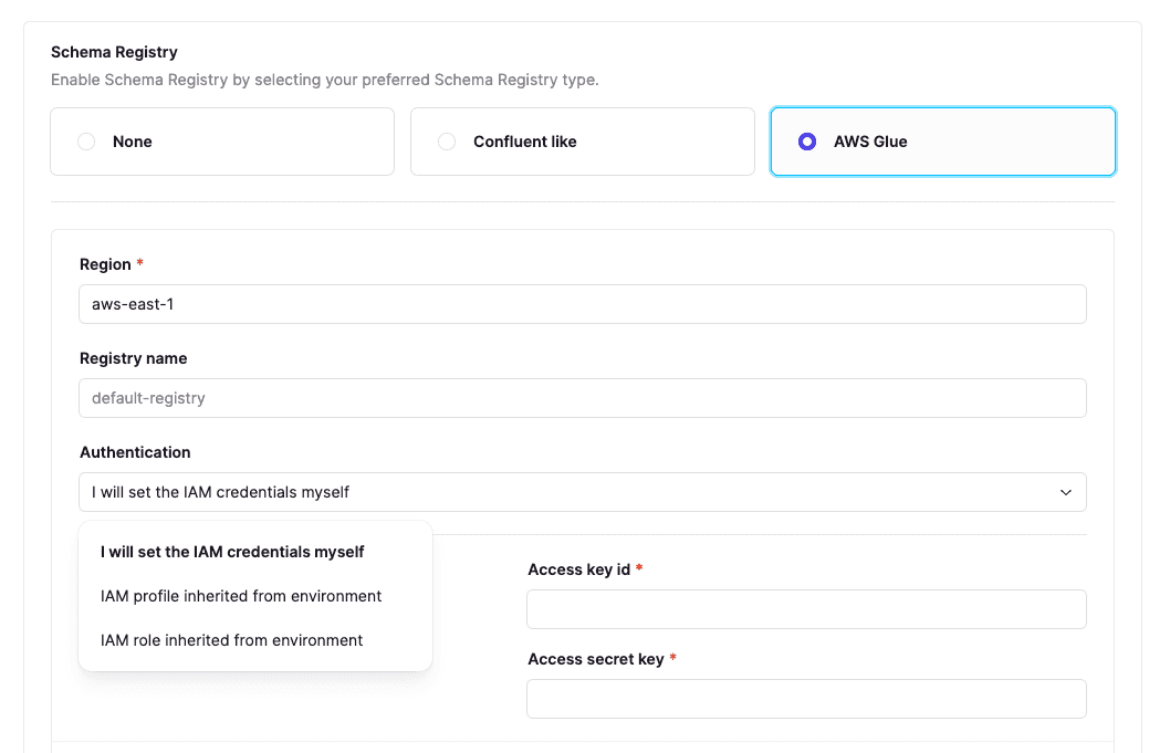 Conduktor fully supports AWS Glue with the same IAM strategies as MSK connections.