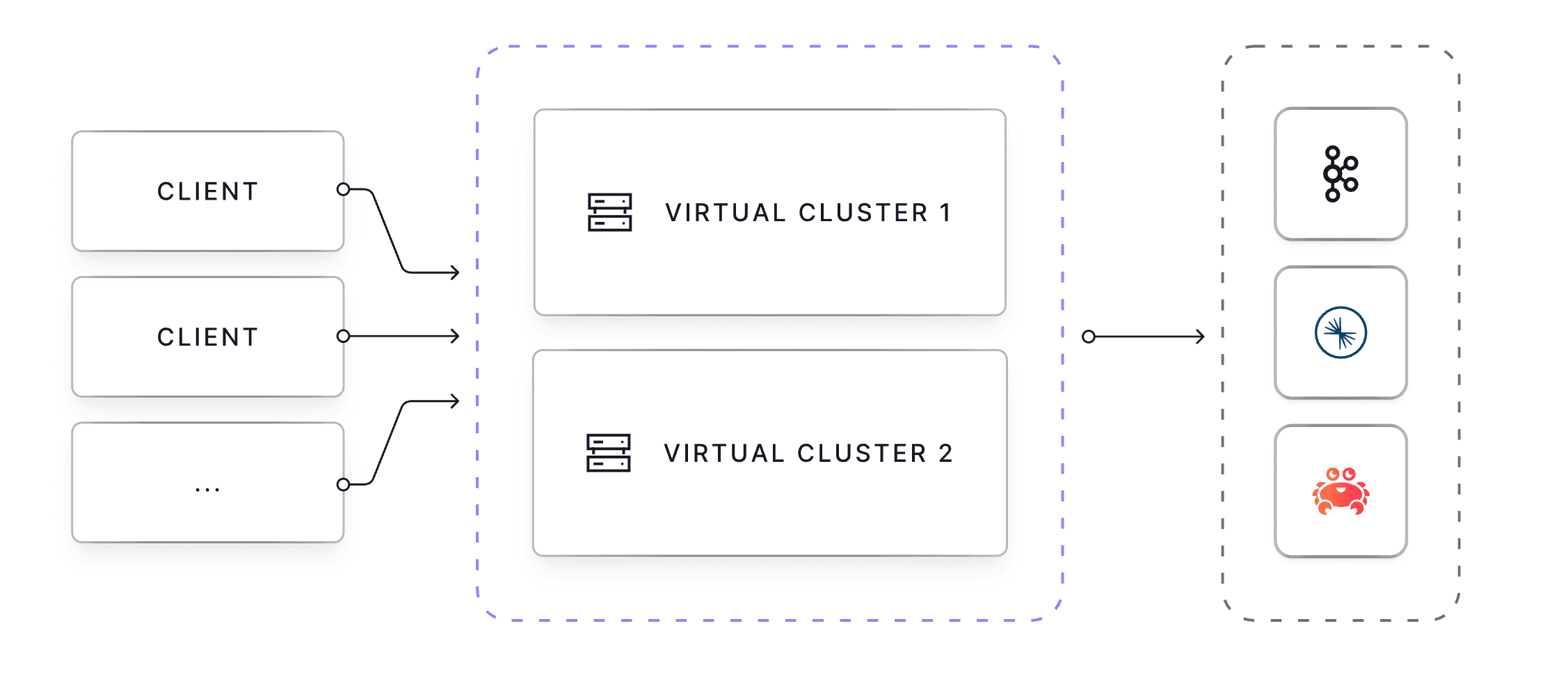 This vendor-agnostic layer increases utilization per cluster. It also enables data isolation (multi-tenancy with tenant-specific rules) and virtual topics via SQL statements for data projections, without deploying additional infrastructure.