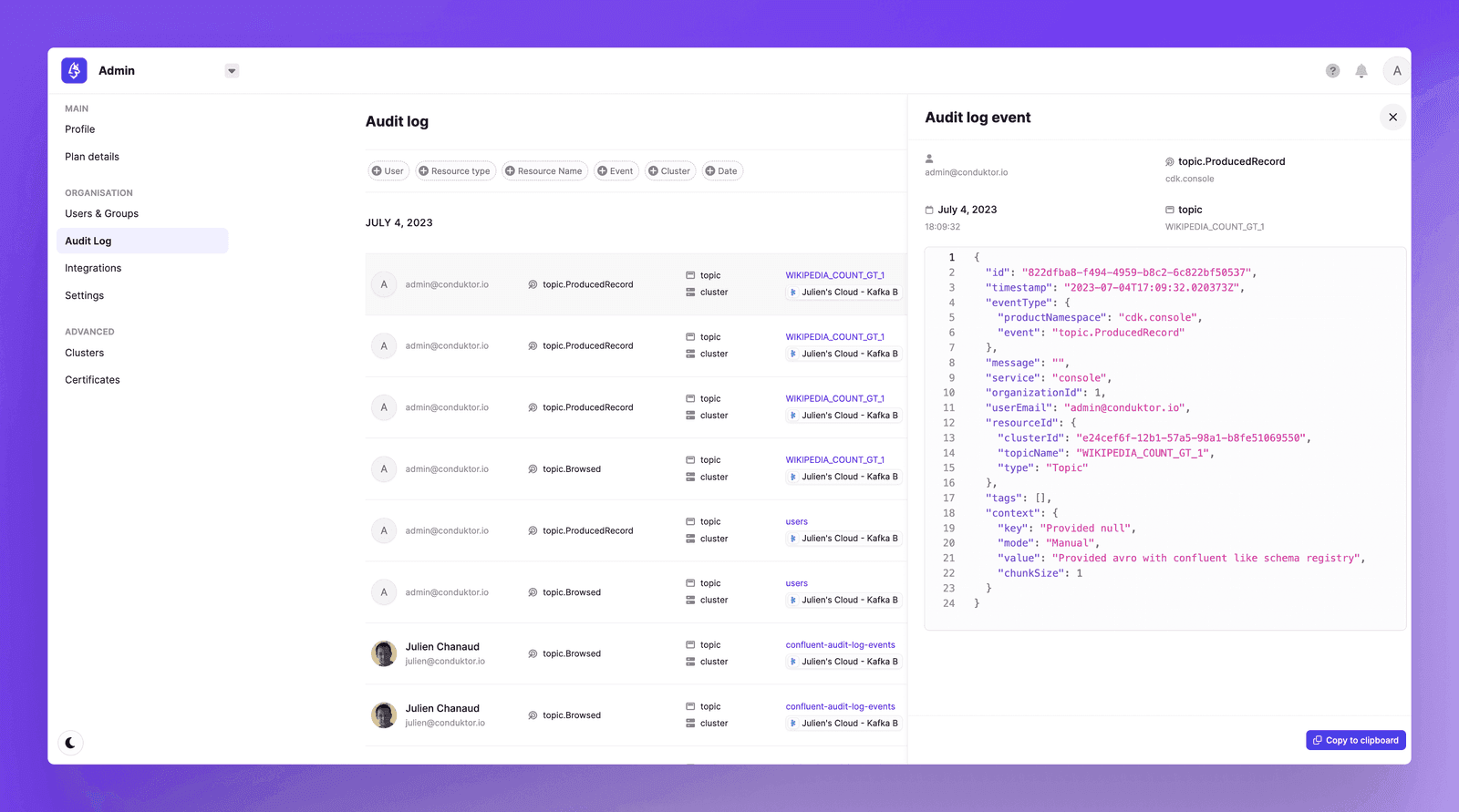 Every operation shows: who performed it, which resources were affected, when it happened, and relevant context. Filtering tools help search and analyze logs quickly.