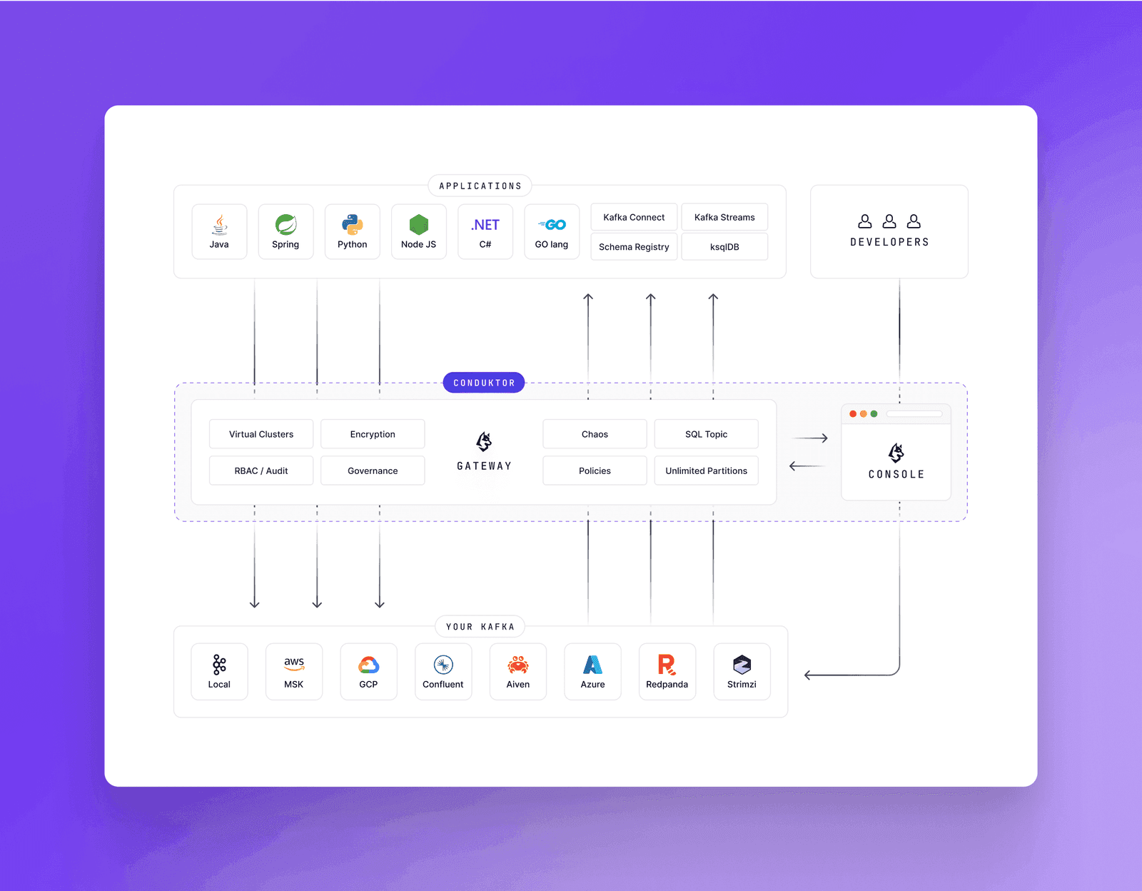 Console integrates with Conduktor Gateway, a Kafka proxy between client applications and clusters.