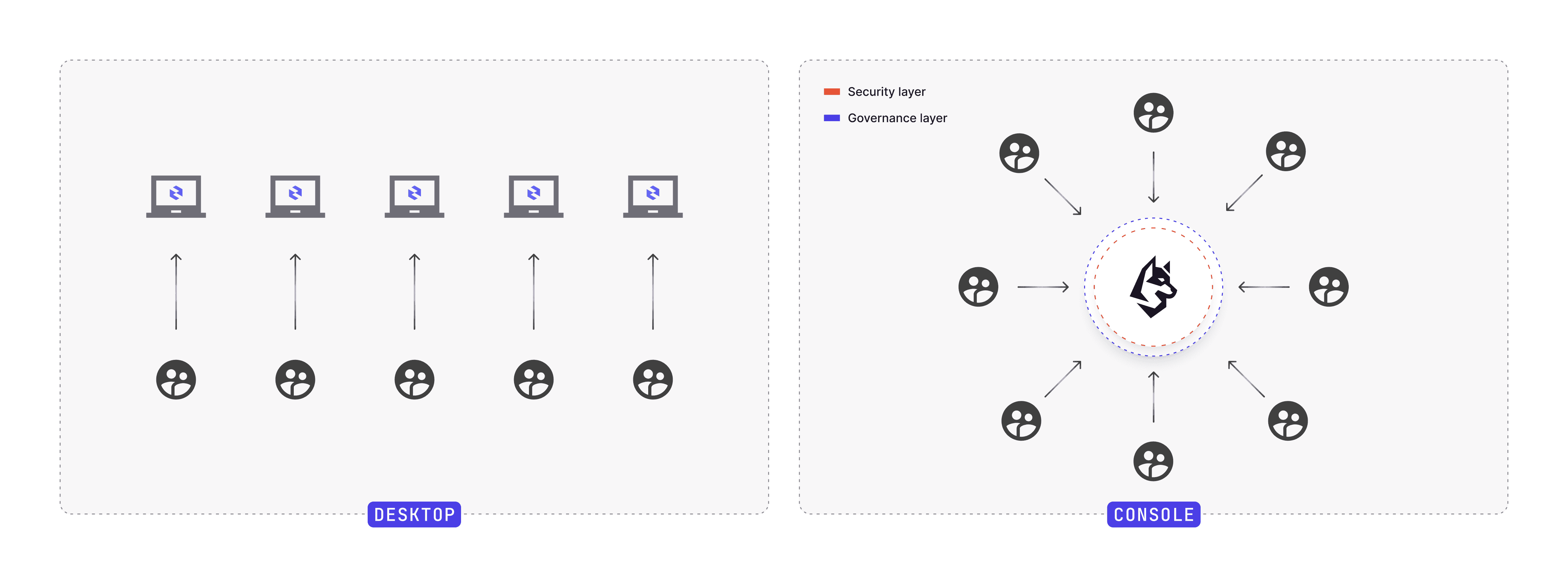 Console runs as a single, centralized deployment. SSL/TLS certificates are managed once, not per-user.