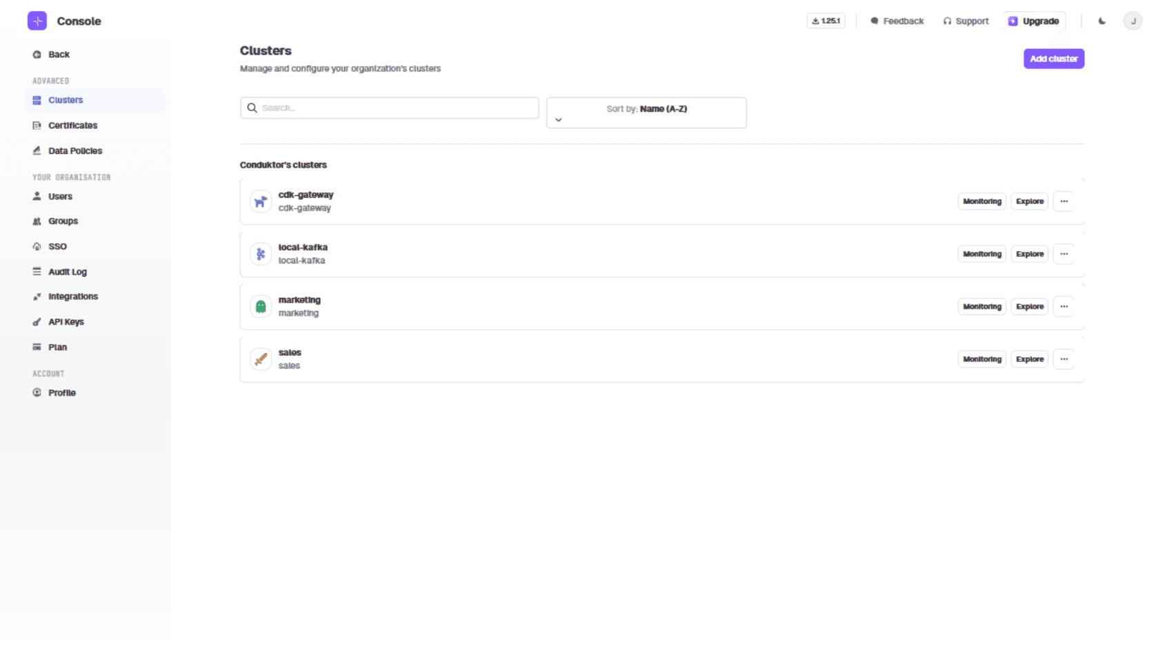 curl --request POST 'http://localhost:8888/admin/vclusters/v1/vcluster/sales/username/admin' \--user 'admin:conduktor' \--header 'Content-Type: application/json' \--silent \--data-raw '{"lifeTimeSeconds": 7776000}' | jq -r '.token' | tee sales-admin.properties Add the sales cluster in Conduktor Console using 'Manage Clusters'. Use SASL_PLAINTEXT, PLAIN, the Gateway bootstrap server, and the sales vCluster token as password.