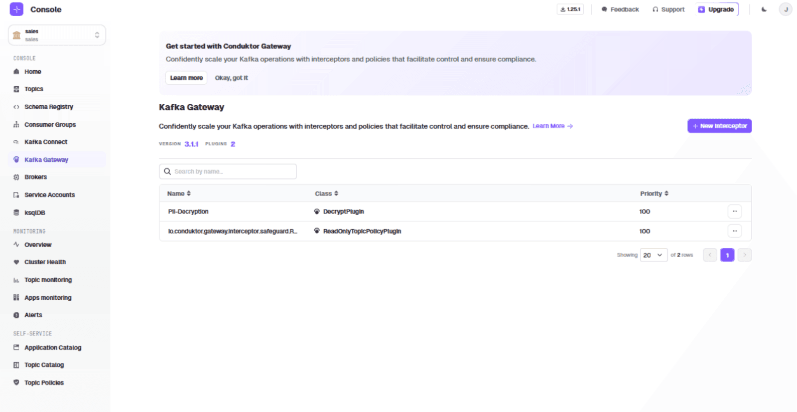 In the UI, go to Kafka Gateway and click 'Create my first interceptor'.